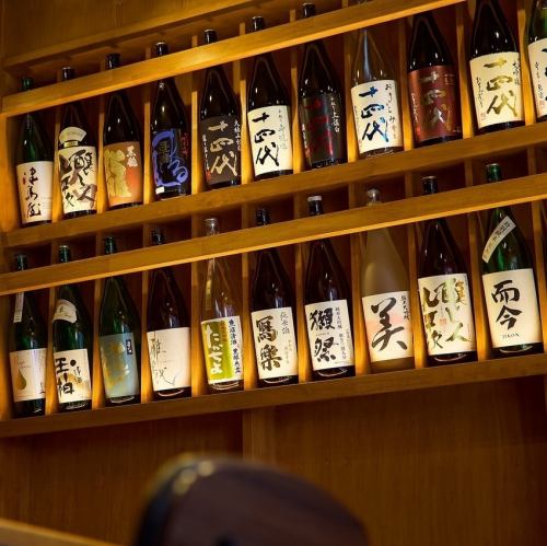 圧巻の日本酒棚!常時60種あります。飲み放題は40種以上ご用意しております。