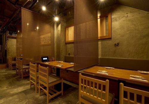 テーブル席は2名様、4名様、6名様と連結してご利用可能です。テーブルの間にロールスクリーンで間仕切りしておりお隣様を気にせず呑めます。